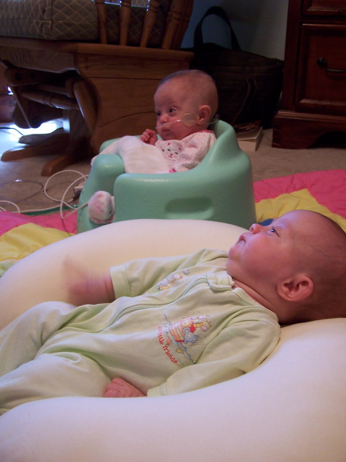 The girls are doing really well. Mattie met with the pulmonologist, and he's ordered a sleep study for her. She does great off her oxygen while awake, but she de-sats while sleeping. Mattie sits up really well and has been cooing and smiling more. She had a busy week last week with the pulmonologist appointment, and an appointment with the eye doctor. She's been released from the eye doctor and doesn't have to go back for any visits. For this, Mattie is grateful.